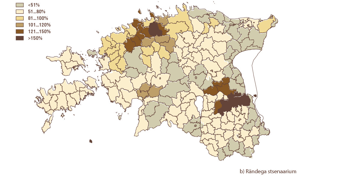 Praeguse sündimuse ja suremuse jätkudes väheneb põhikooliealiste laste arv suuremates linnaregioonides (nt Tallinn ja Tartu) rohkem kui 20% ning see on peamiselt seotud sealse vanuskoosseisu (hetkel on seal lapsi palju) ja sündimuskordajatega, mis on madalamad just suuremates linnades.5 Rändestsenaarium (joonis 4.2.1b), mis eeldab seniste rände-suundumuste jätkumist, näitab aga väga selgelt, kuidas ränne olukorda muudab. Rände tõttu võimendub põhikooliealiste laste arvu vähenemine just suurematest linnaregioonidest väljapoole jäävates linnades ja valdades ning laste arv kasvab rände tõttu kõige enam suuremate linnade tagamaal.