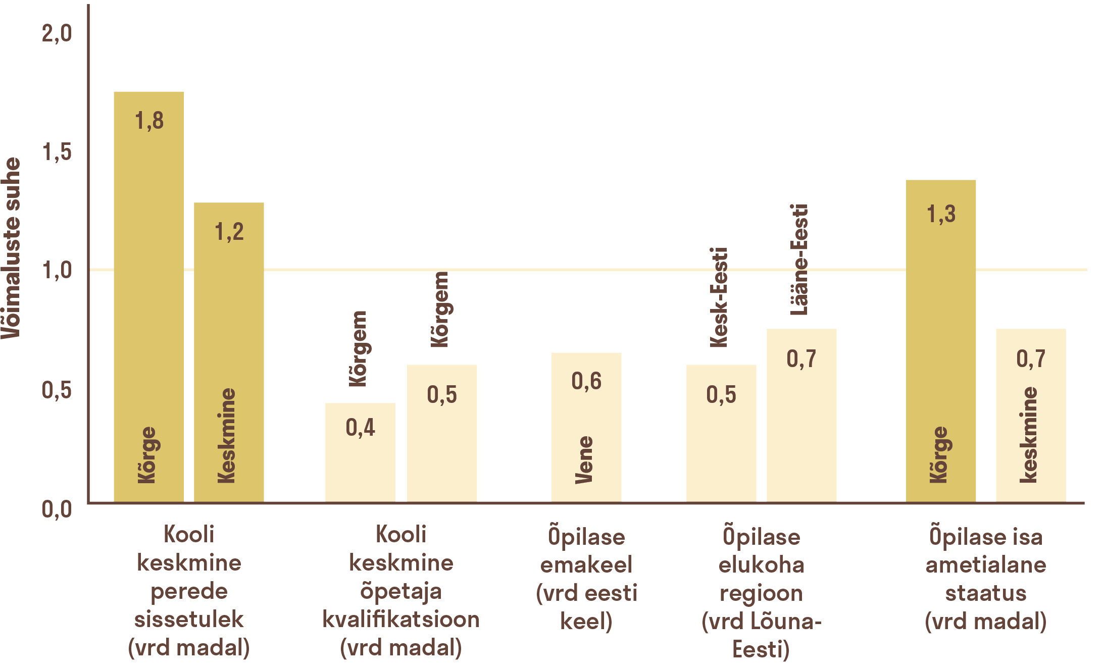Märkus. Joonisel on esitatud ainult statistiliselt olulised tunnused ja kategooriad (usaldusnivoo 90%). Mudelit on kontrollitud kooli keskmise matemaatikaeksami tulemusega, õpilase soo, õpilase ema ametialase staatusega, õpilase ema ja isa haridustasemega.