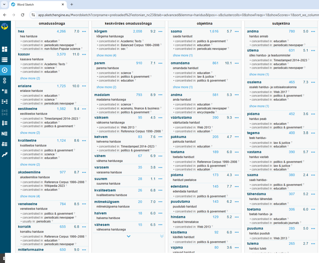 Haridustahtel on Eestis jätkuvalt oluline roll – see on üks selle peatüki keskne sõnum. Tõnis Lukas juhib aga tähelepanu tajutavale kontrastile haridustahte ja -tahtmatuse vahel. Hariduse edasiviivat ja positiivset rolli kinnitab ka Sketch Engine’i abil tehtud eesti keele korpuse analüüs1 , mis aitab tuua nähtavale, millistes tähendusseostes sõna „haridus“ kasutatakse (joonis 1.0.1).