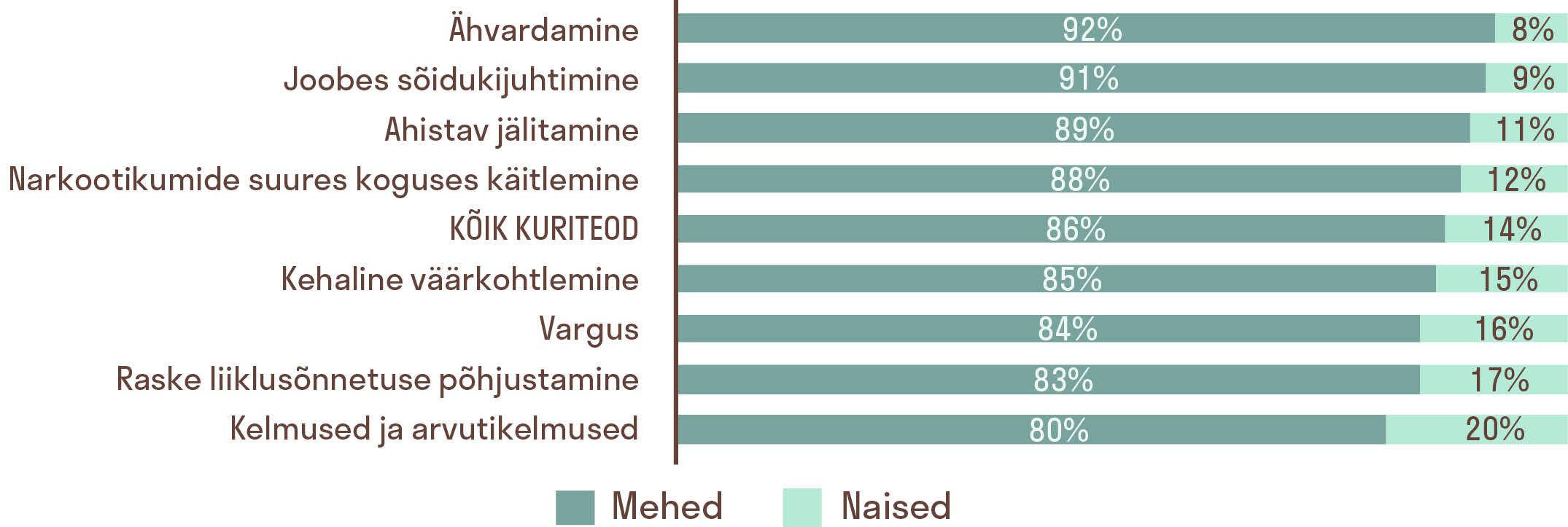 Registreeritud kuritegudest on läbi aastate ligikaudu 90% toime pandud meeste poolt. Enamlevinud kuriteoliikidest oli perioodil 2018–2023 (joonis 7.5.1) meeste osakaal suurim ähvardamistes (92%), millele järgnes joobes sõidukijuhtimine (91%). Suurima naiste osakaaluga kuriteoliik on kelmused (20%).