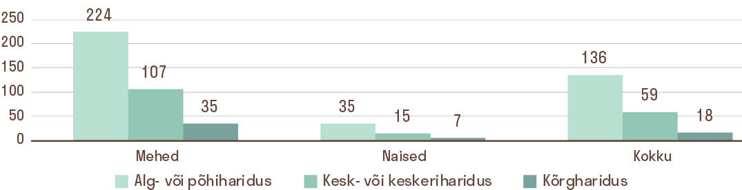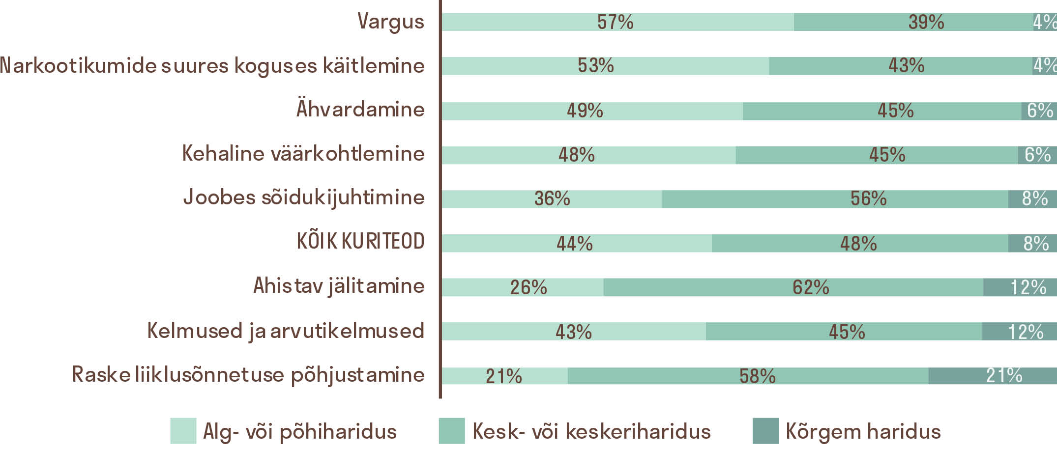 - Kõrgem haridustase vähendab õigusrikkumiste toimepanemise riski. Kohtusse saadetud isikute hulgas on olnud suurim alg- või põhiharidusega isikute osakaal ning kõige vähem on olnud kõrgharidusega isikuid.