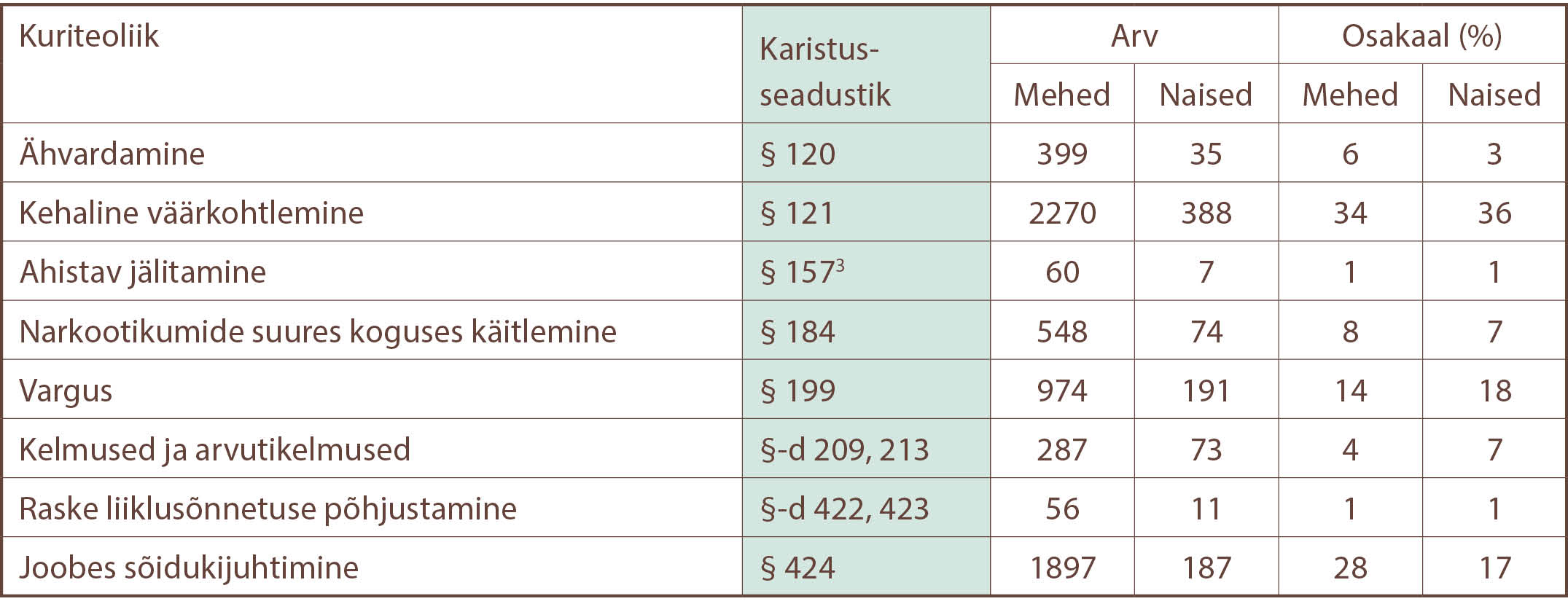 Kuriteo raskuse kasvuga enamasti tõuseb meeste osakaal; samuti on keskmine kuritegude arv meeste puhul suurem kui naiste puhul. Nii meeste kui ka naiste puhul on kuritegude toimepanijate seas kõige enam olnud kehalises väärkohtlemises kahtlustatavaid (tabel 7.5.1), kellest ligikaudu pooled olid toime pannud lähisuhtevägivalla kuriteo. Siinjuures tuleb arvestada, et toimepanija tehakse vägivallakuritegudes kindlaks märksa sagedamini kui varavastastes kuritegudes ning liikluskuritegudes on toimepanija teada peaaegu alati.5