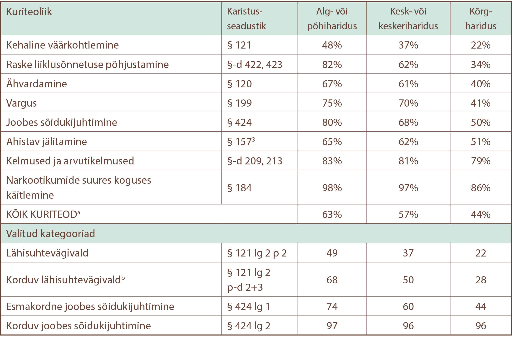 Kohtusse saadetud isikute osakaal on olnud kõige suurem alg- või põhiharidusega isikute puhul ning madalaim kõrgharidusega isikute puhul (tabel 7.5.3). Erinevused alg- või põhiharidusega ning kõrgharidusega toimepanijate vahel on suhteliselt suured vägivallakuritegude, varguste ja liikluskuritegude puhul, kuid väikesed kelmuste ja arvutikelmuste ning narkokuritegude puhul. Erandiks on korduv joobes sõidukijuhtimine (KarS § 424 lg 2), mille puhul prokuratuur üldjuhul menetlust otstarbekuse kaalutlusel ei lõpeta.