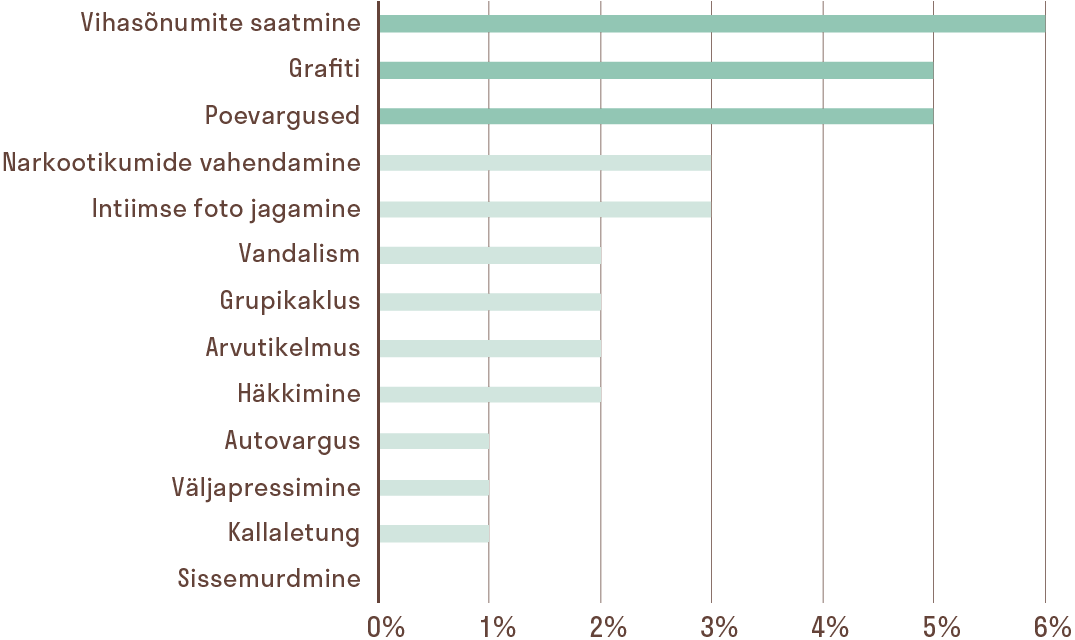 Viiendik küsitletud noortest on viimasel aastal toime pannud vähemalt ühe loetelus nimetatud teo. Kui jätta kõrvale külmrelva kaasas kandmine, siis kõige sagedamini on noored varastanud midagi poest või ostukeskusest (5%), joonistanud grafiti (5%) või saatnud sotsiaalmeedias haavavaid sõnumeid või kommentaare, mis on suunatud kellegi rassi, etnilise kuuluvuse, rahvuse, religiooni, sooidentiteedi või seksuaalse orientatsiooni vastu (6%; nn vihasõnumite saatmine). Tõsisemad õigusrikkumised, nagu sissemurdmine varguse eesmärgil, mootorratta või auto vargus ning väljapressimine, on esinenud harva – nende tegude toimepanemist on uuringus tunnistanud alla 1% vastanutest.