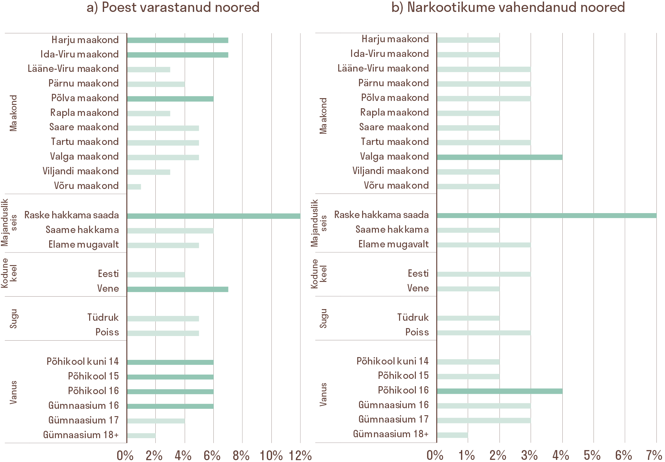 Joonis 7.2.2 Poest varastanud või narkootikume vahendanud noorte osakaal sotsiaal- demograafiliste kategooriate kaupa uuringule eelnenud 12 kuu jooksul