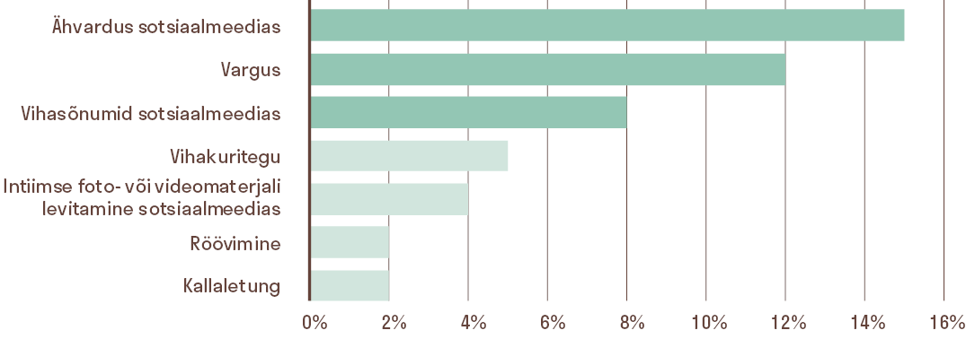 Sotsiaalmeedias langes uuringule eelnenud aasta jooksul ohvriks 19% lastest. Kõige sagedamini kogeti ähvardusi (15%), vihasõnumeid (8%) ja nõusolekuta intiimfotode või -videote jagamist (4%) (joonis 7.2.3). Ühe enim levinud teona, mida 6% noortest uuringule eelnenud aastal toime pani, toodi välja haavavad sõnumid, mis olid suunatud kellegi rassi, etnilise kuuluvuse, rahvuse, religiooni, sooidentiteedi, seksuaalse orientatsiooni või muu sarnase omaduse vastu. Vihasõnumeid olid sotsiaalmeedia kaudu saanud 8% küsitletud noortest. Kõige suurem risk sotsiaalmeedias vihaga kokku puutuda, olgu siis ohvri või toimepanijana, on põhikooliõpilastel. Sugu mängib samuti rolli: poisid satuvad enamasti toimepanijate, tüdrukud aga ohvrite poolele. Venekeelsetel noortel on oht ohvriks langeda suurem; pere majanduslik olukord mõjutab küll ohvriks langemist, kuid mitte rikkumise toimepanemist.