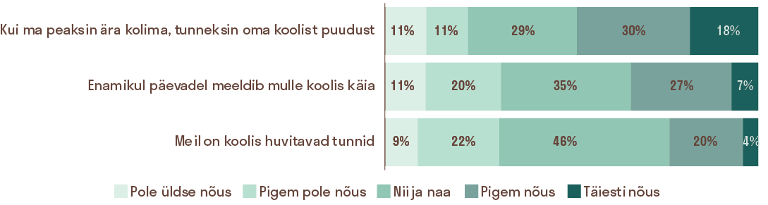 ISRD4 uuringus küsiti laste käest, kas neile meeldib koolis käia, kas koolis on huvitavad tunnid ning kas laps tunneks koolist puudust, kui peaks ära kolima (joonis 7.2.4). Umbes iga kolmas noor leiab, et tunnid koolis ei ole huvitavad, ja iga neljas leiab, et tunnid on huvitavad. Üle kolmandiku lastest leiab, et neile meeldib koolis käia ja sama palju on vastupidisel arvamusel. ISRD4 uuring näitab, et peaaegu pooled lastest tunneksid koolivahetusel oma praegusest koolist puudust. See rõhutab, kui oluline on koolis kujunev sotsiaalne side – läbi sõprussidemete ja toetavate suhete kasvab õppurite huvi kooli vastu ning paraneb nende heaolu. Samas tuleb pöörata eraldi tähelepanu neile koolidele, kus selline ühtne sotsiaalne pind pole veel loodud.