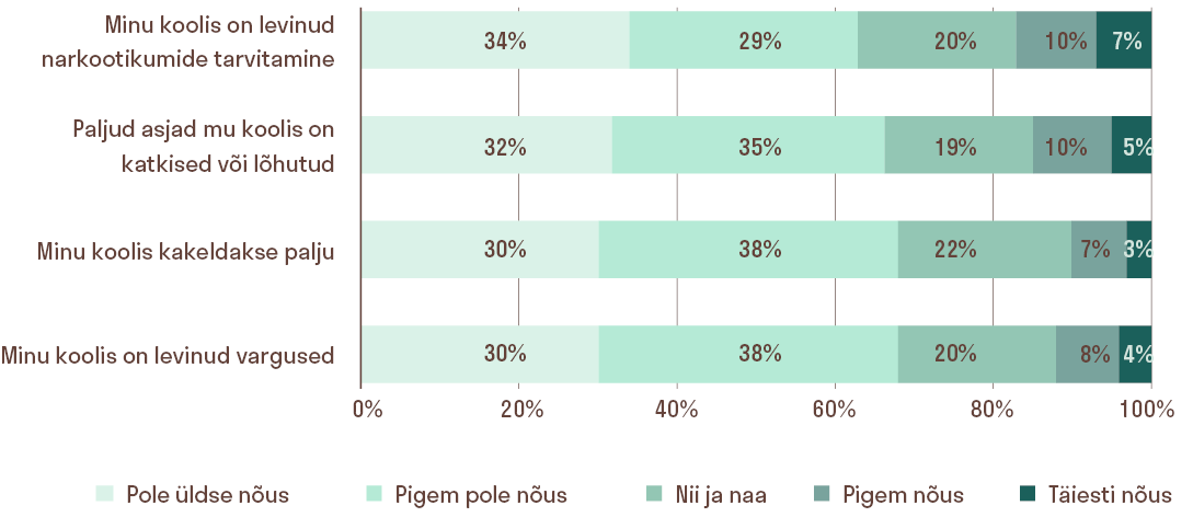 Kooli füüsilise keskkonna iseloomustamiseks ISRD4 uuringu raames uuriti noorte käest, kas on nähtavaid korratuse märke: paljud asjad koolis on katkised ja lõhutud. Samuti uuriti, mil määral on koolis, kus nad käivad, levinud õigusrikkumised, nagu vargused, kaklused, narkootikumide tarvitamine (joonis 7.2.5). 10% noortest nõustus, et nende koolis on paljud asjad katkised, 10% arvas, et koolis kakeldakse palju, 12% nõustus, et koolis on levinud vargused ja 17% arvates on koolis levinud narkootikumide tarvitamine. Gümnaasiumis õppivad noored tunnevad põhikooliõpilastest peaaegu viis korda sagedamini, et nende koolis on tugev kord. Vene keelt kõnelevates peredes kasvanud õpilased tajuvad nende koolis valitsevat koolikorda tugevamalt võrreldes eesti keelt kõnelevate õpilastega.