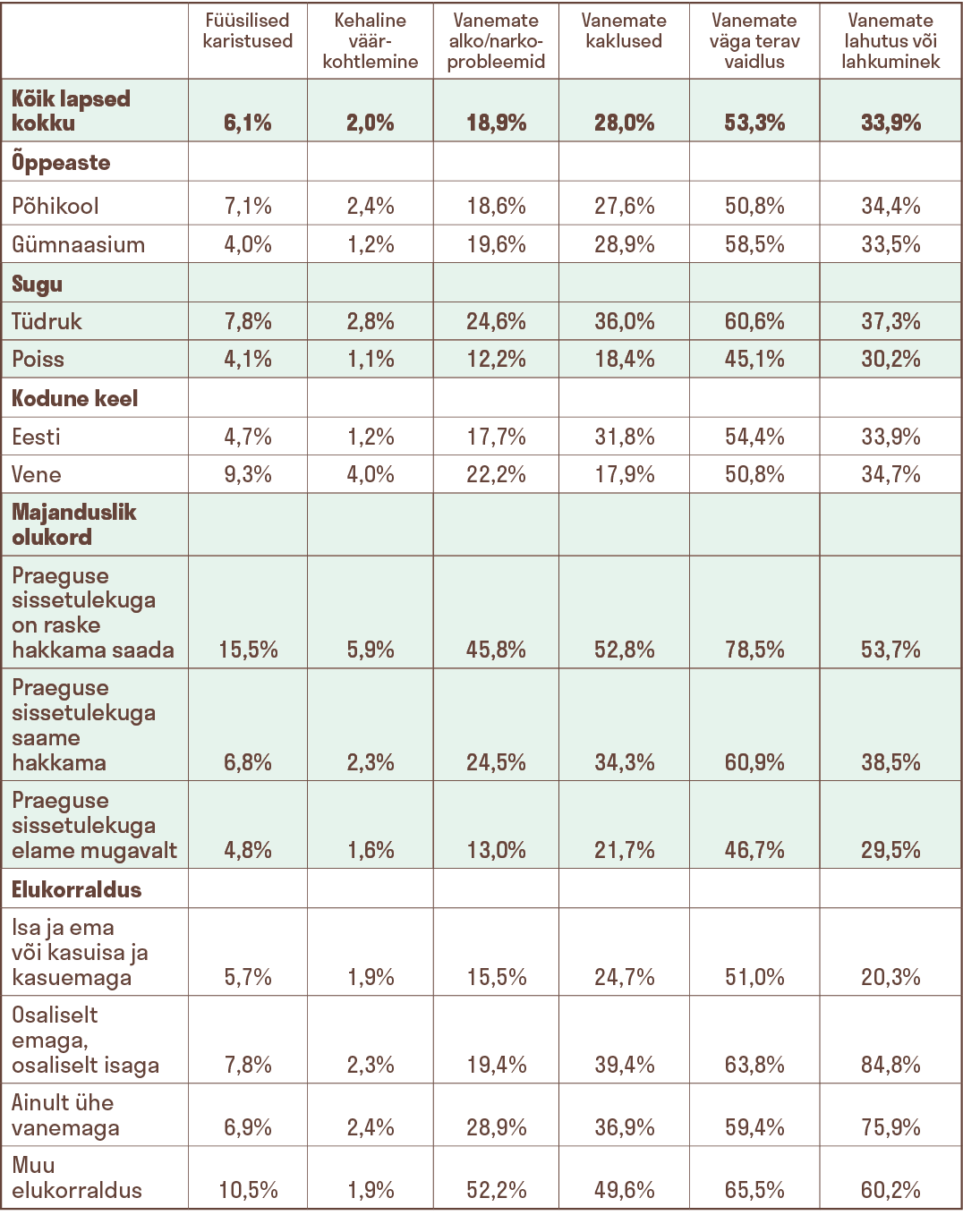Tabel 7.2.1 Perekondlike probleemidega kokku puutunud laste osakaal